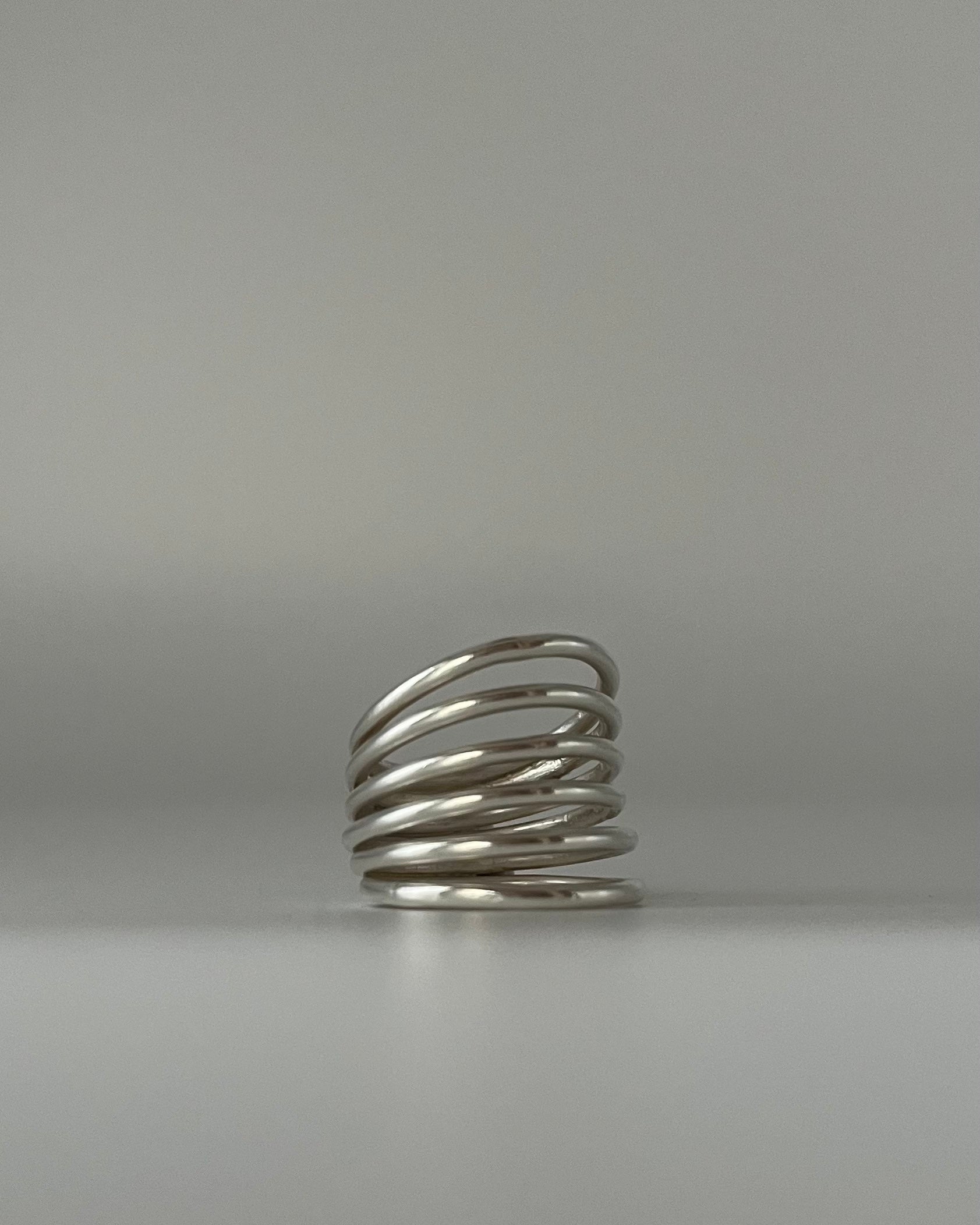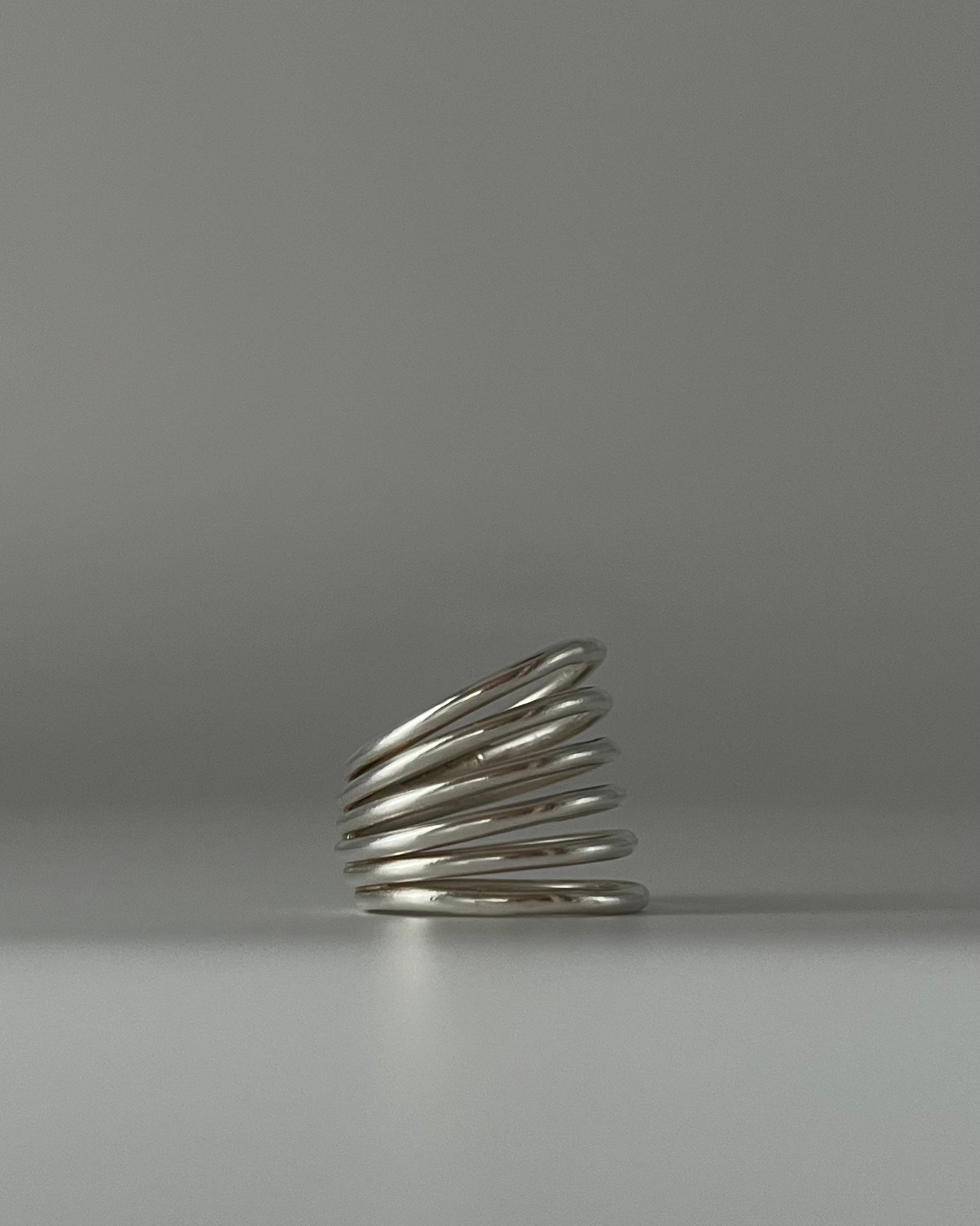 Flight Paths is a multi-band ring formed from six loops of sterling silver wire, fanned and bound into a single structure. The bands spiral without meeting, tracing parallel trajectories that suggest orbit rather than alignment.