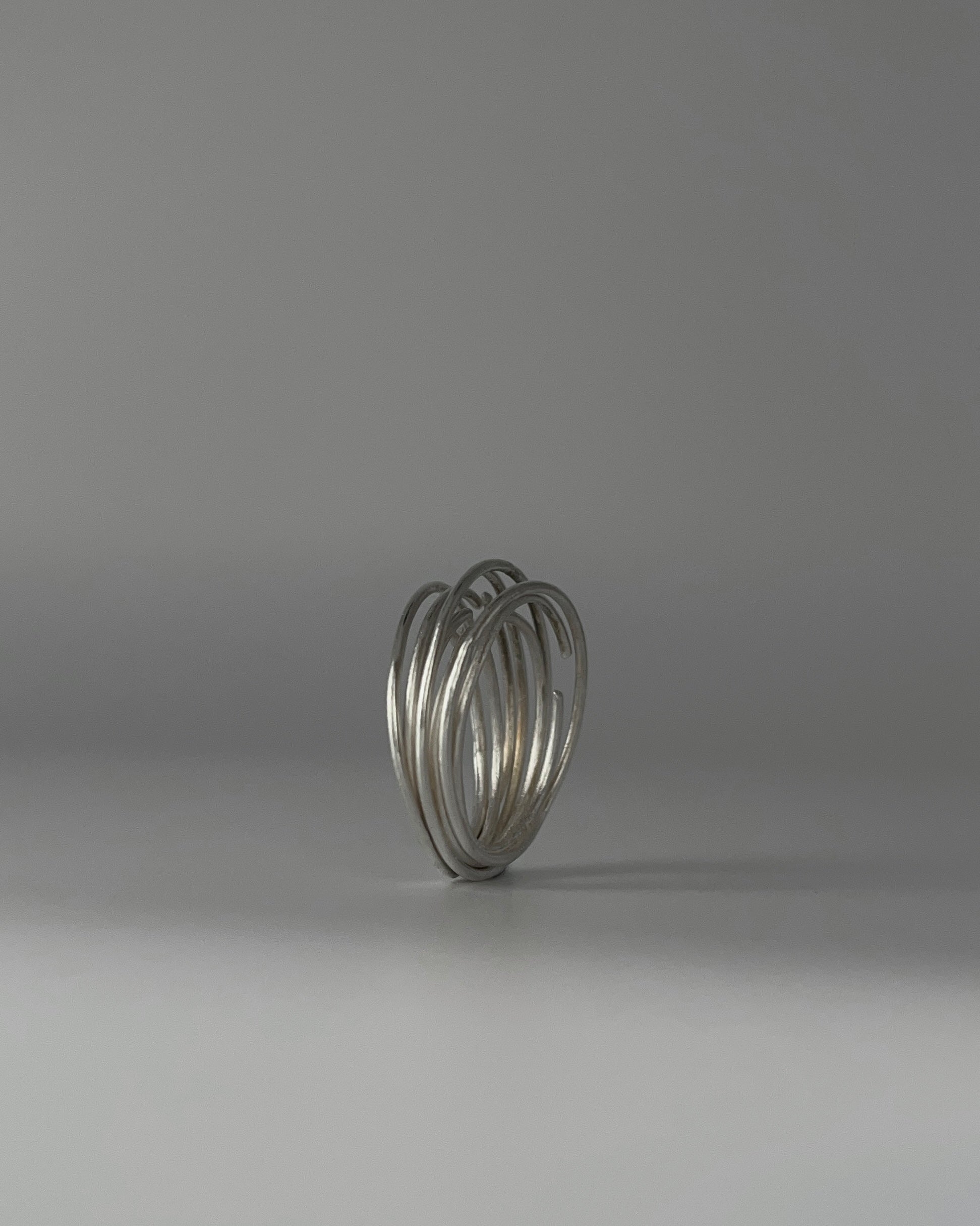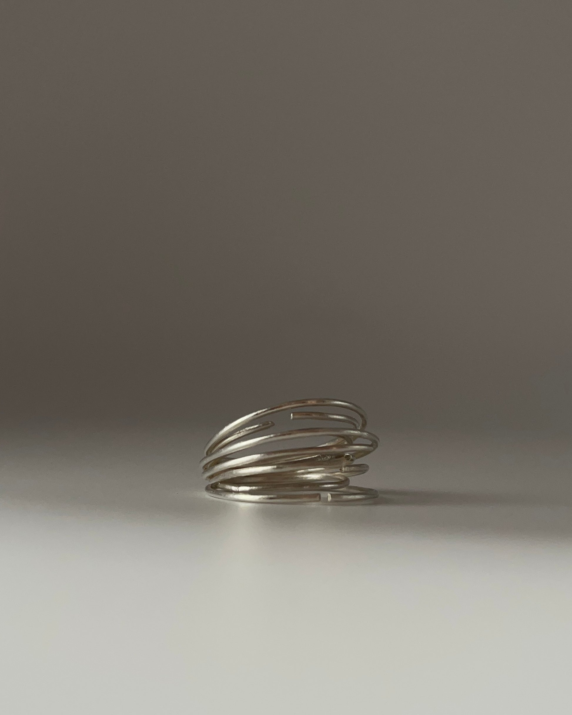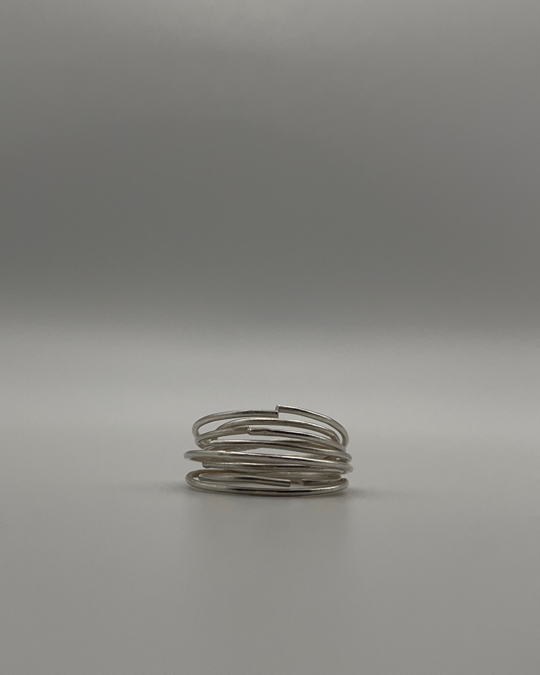 Holding Pattern is a wide, open ring constructed from nine sterling silver bands of varying diameters and heights. Some bands remain closed, while others are sawn open, kinked, or allowed to slip and interlock, disrupting the continuity of the form. The structure holds large pockets of air, producing a sense of motion suspended rather than resolved.