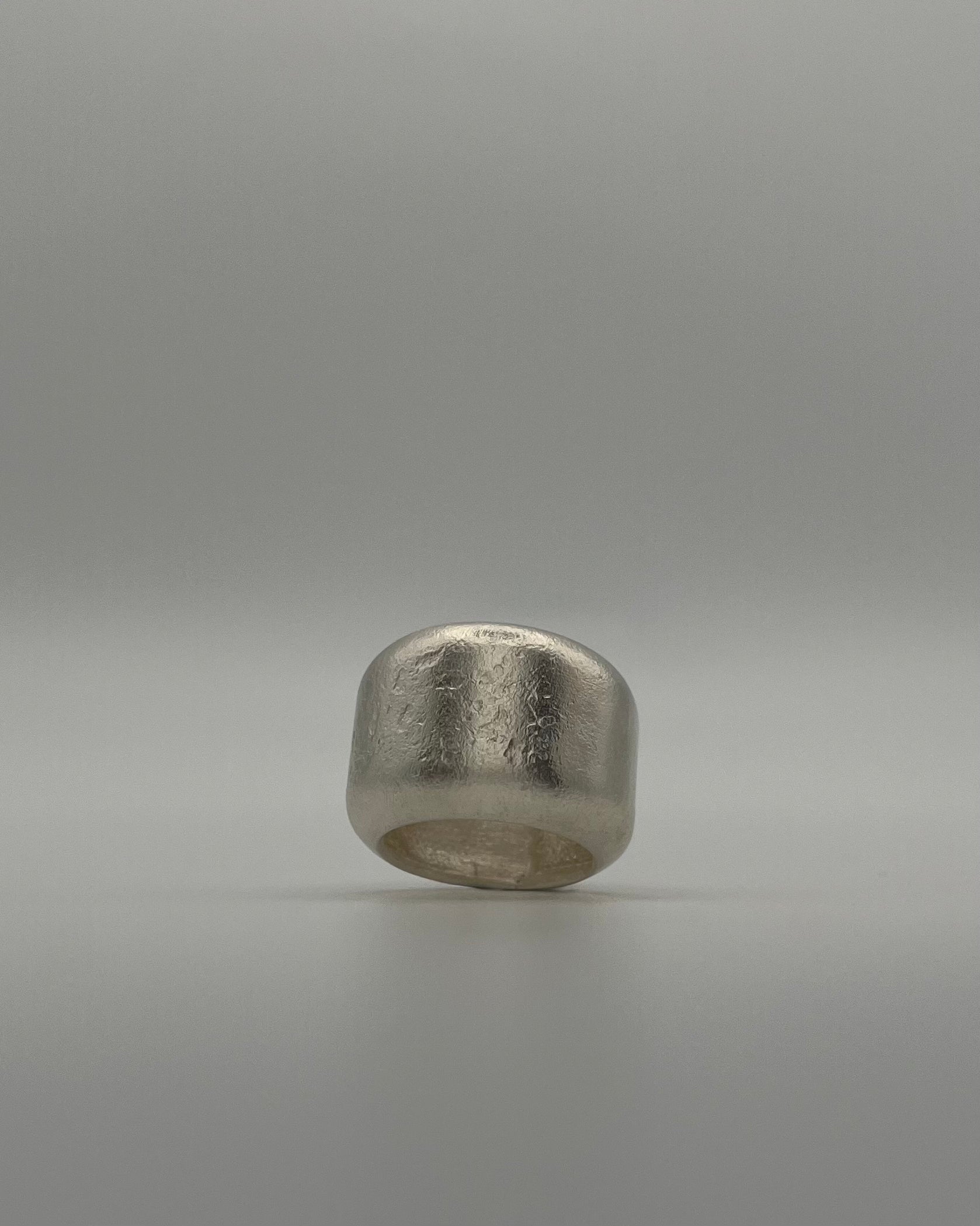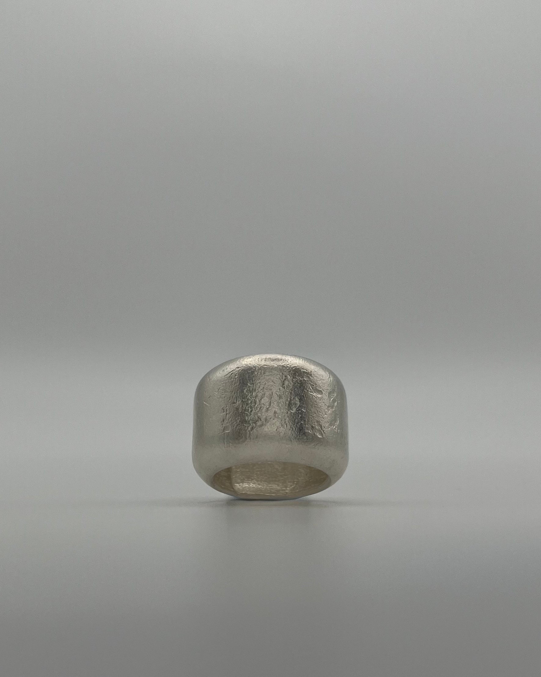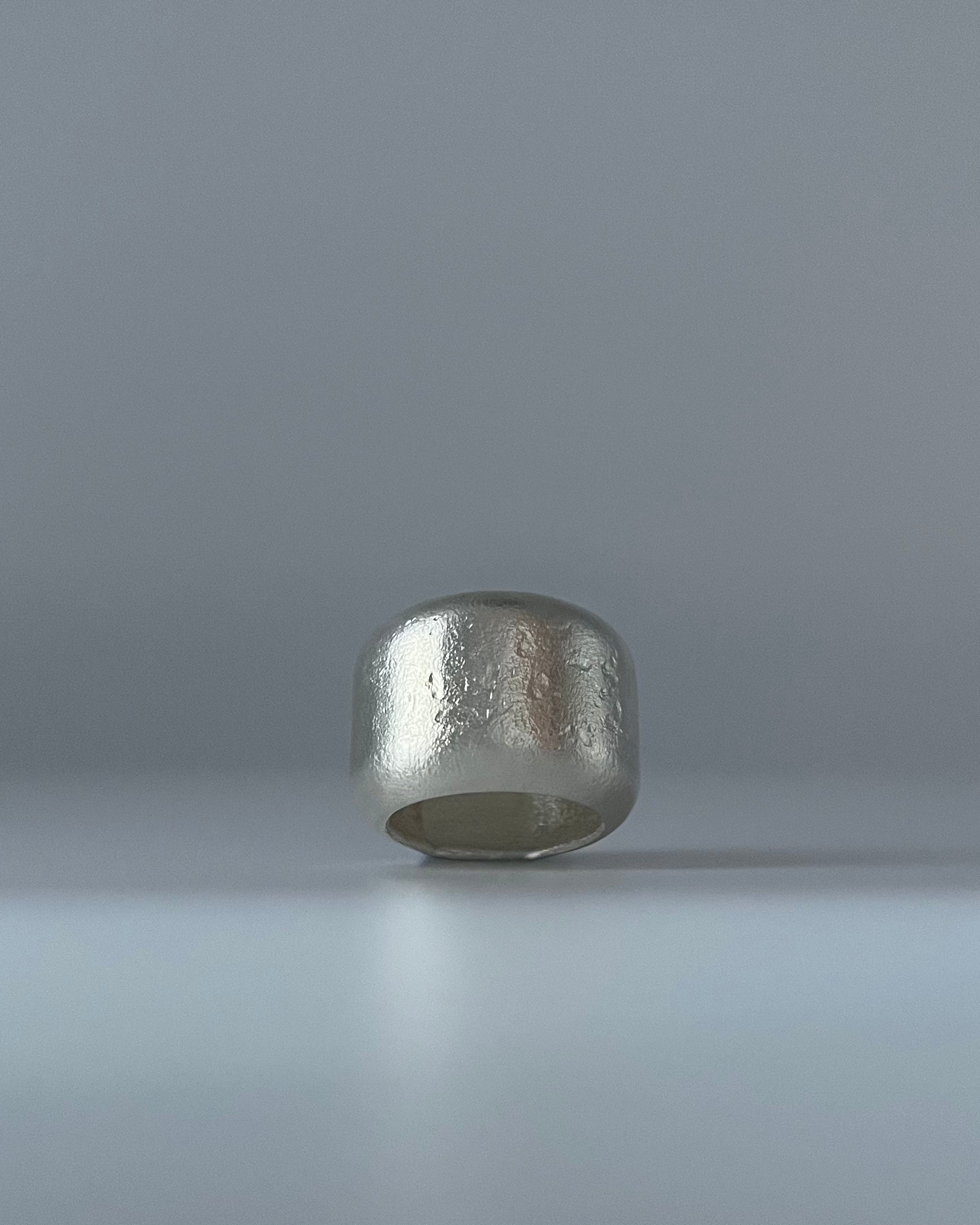 Kneeling Figure in Silver is a wide, domed sterling silver band with a reticulated, skin-like surface and a series of shallow indentations concentrated along one third of the ring. The form is deliberately convex and weighted, recalling the pressure and volume of bent knees against the ground. These indentations were made using domestic objects - keys, transforming tools of access and return into instruments of impact.