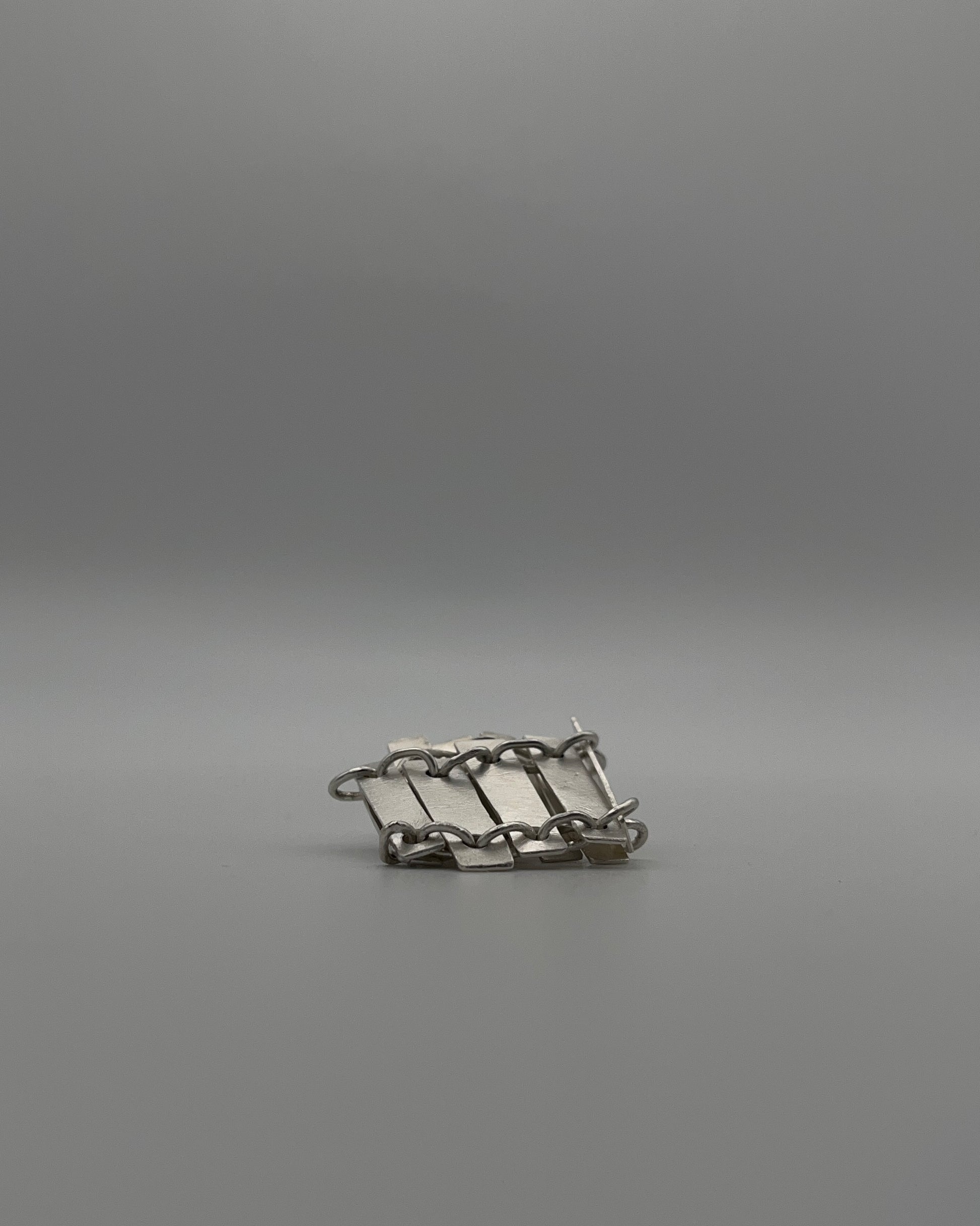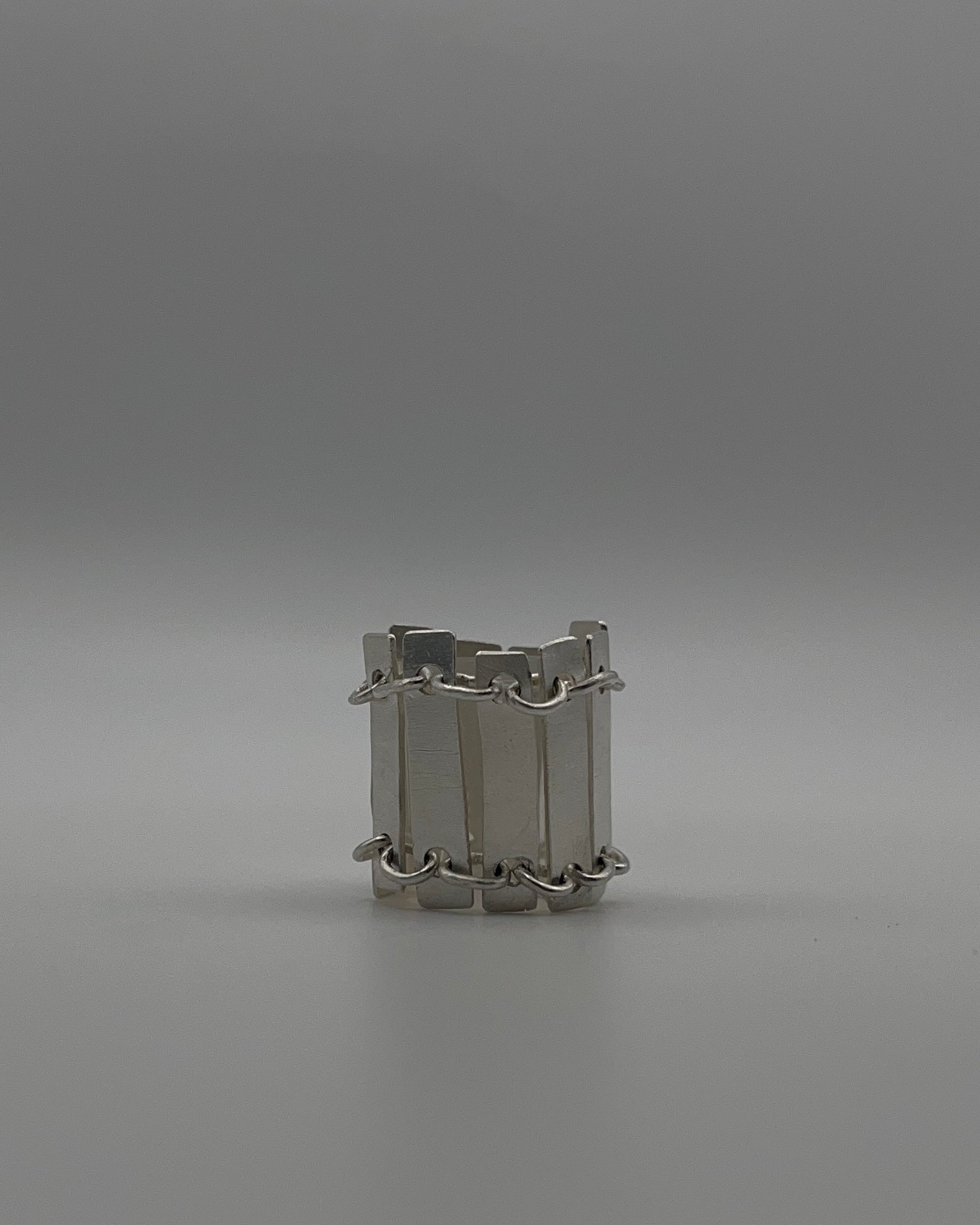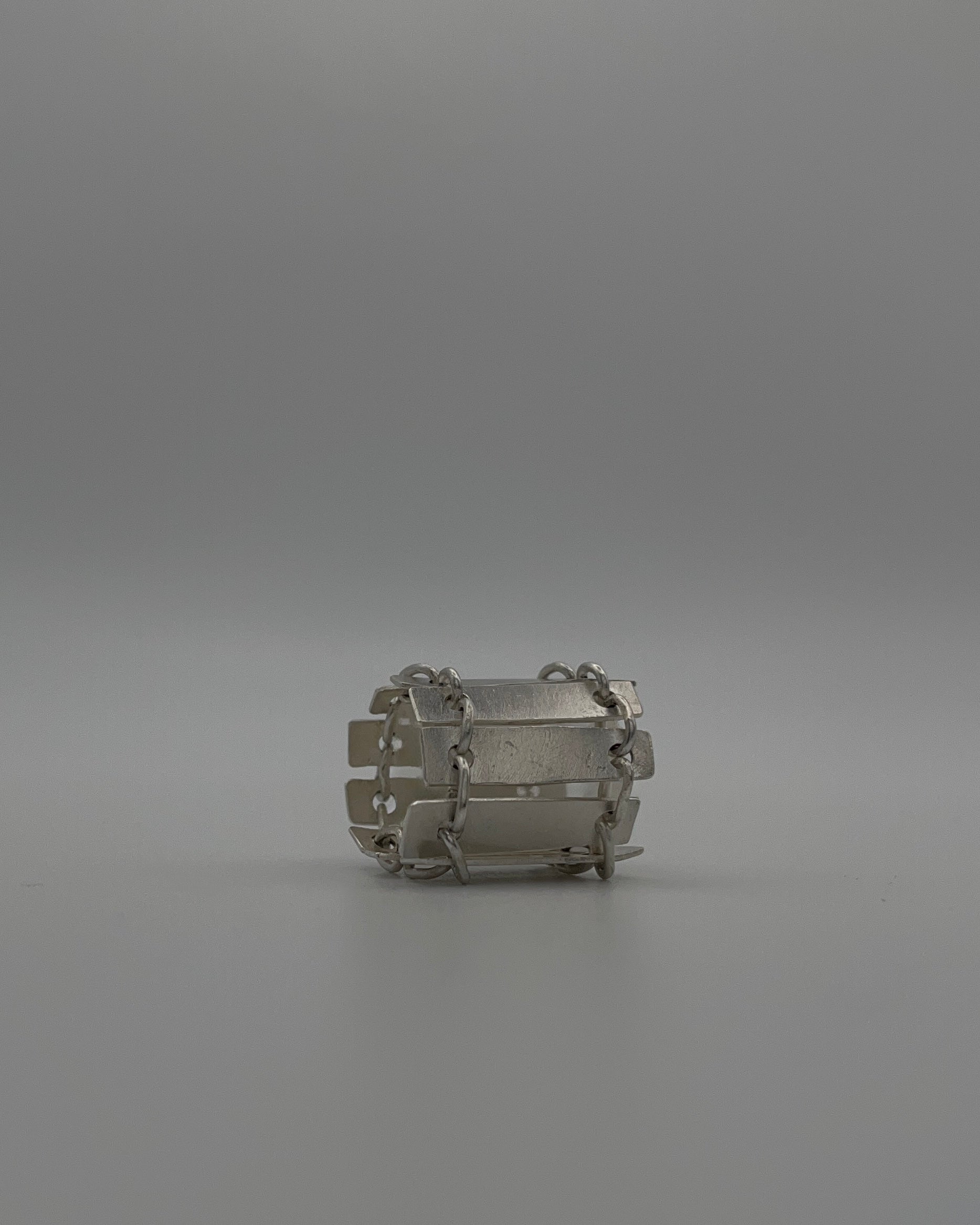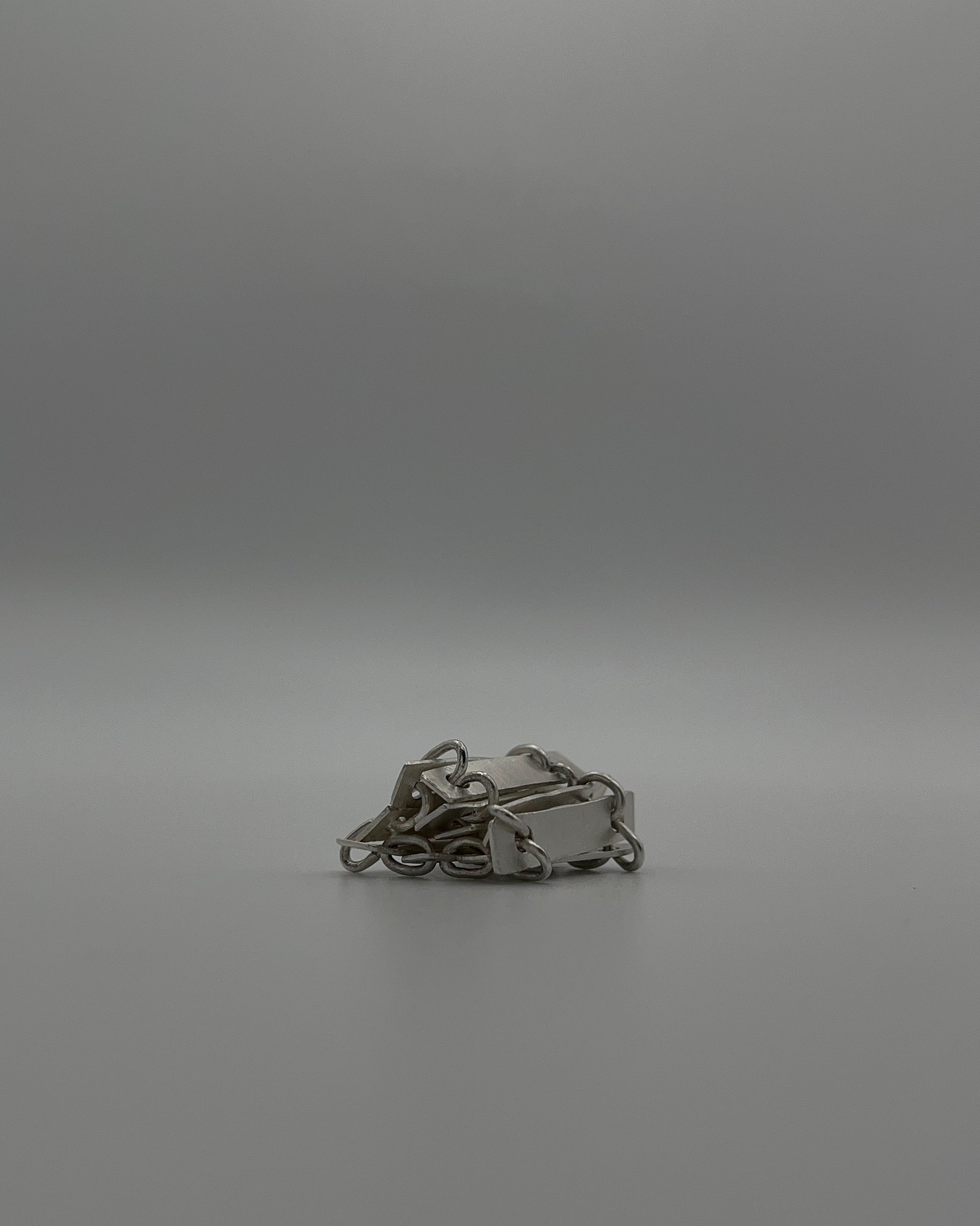 Refusal is a chain-constructed sterling silver ring formed from rectangular plates linked by hand-made connections. Its brushed, eroded surfaces read as worn and lived-in, registering use rather than finish. Unlike the other works in Holding Pattern, this ring cannot sustain its structure independently. When removed from the body, it collapses into a fallen architecture – a ruin, or a relic. Only when worn does it cohere into an intelligible form.