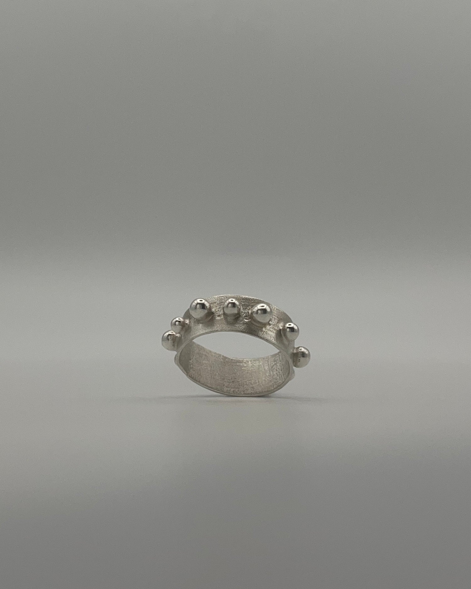 Worry Ring is a slim sterling silver band, hand-textured on both the interior and exterior, with alternating large and small polished granulations set along its circumference. The granulated surface is designed to be handled: twisted, rotated, and repeatedly touched, allowing the ring to accrue wear through use.